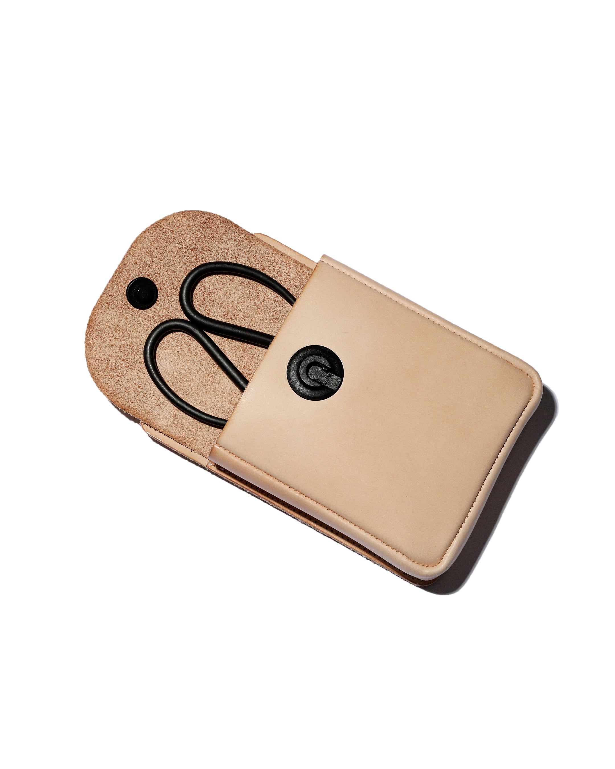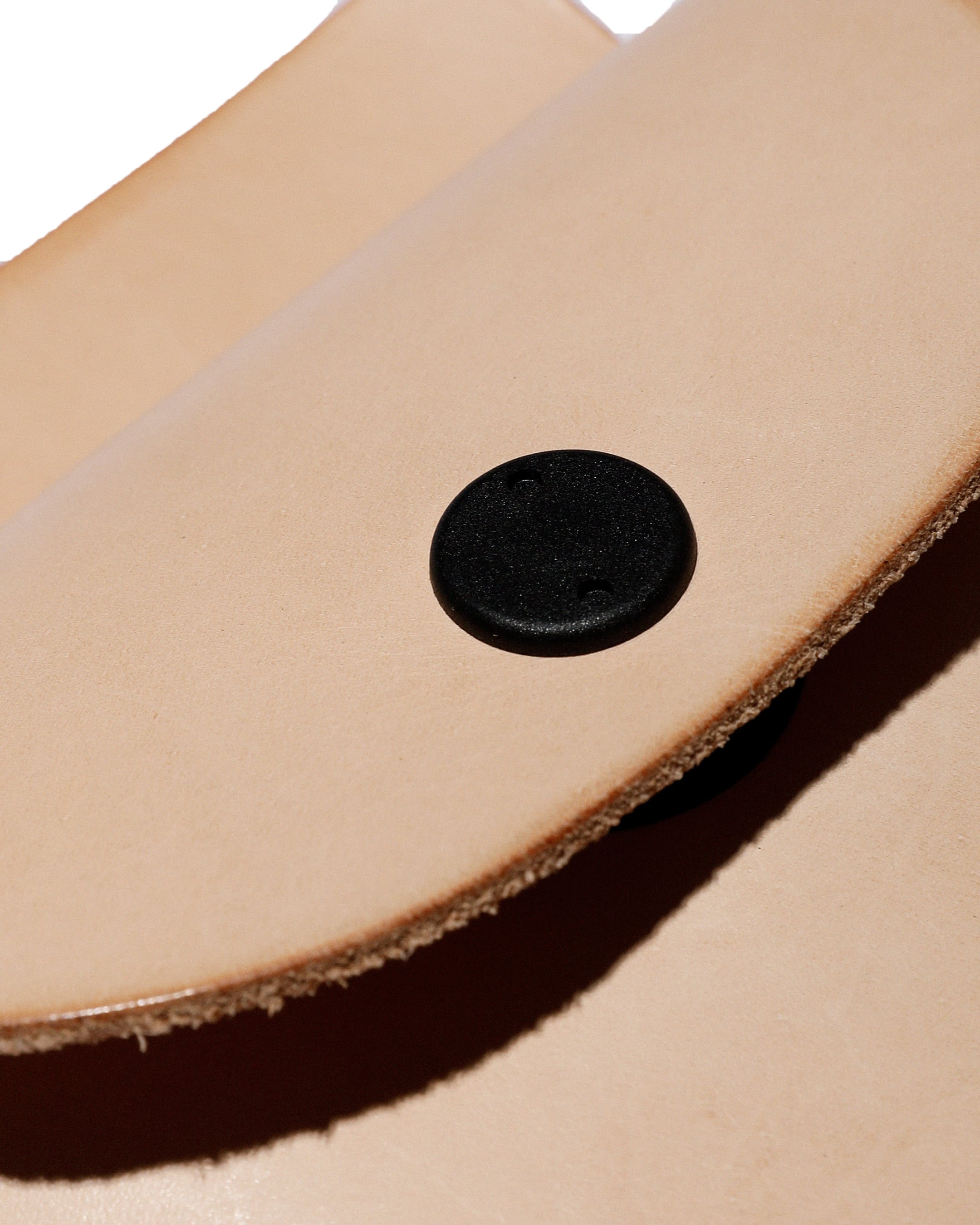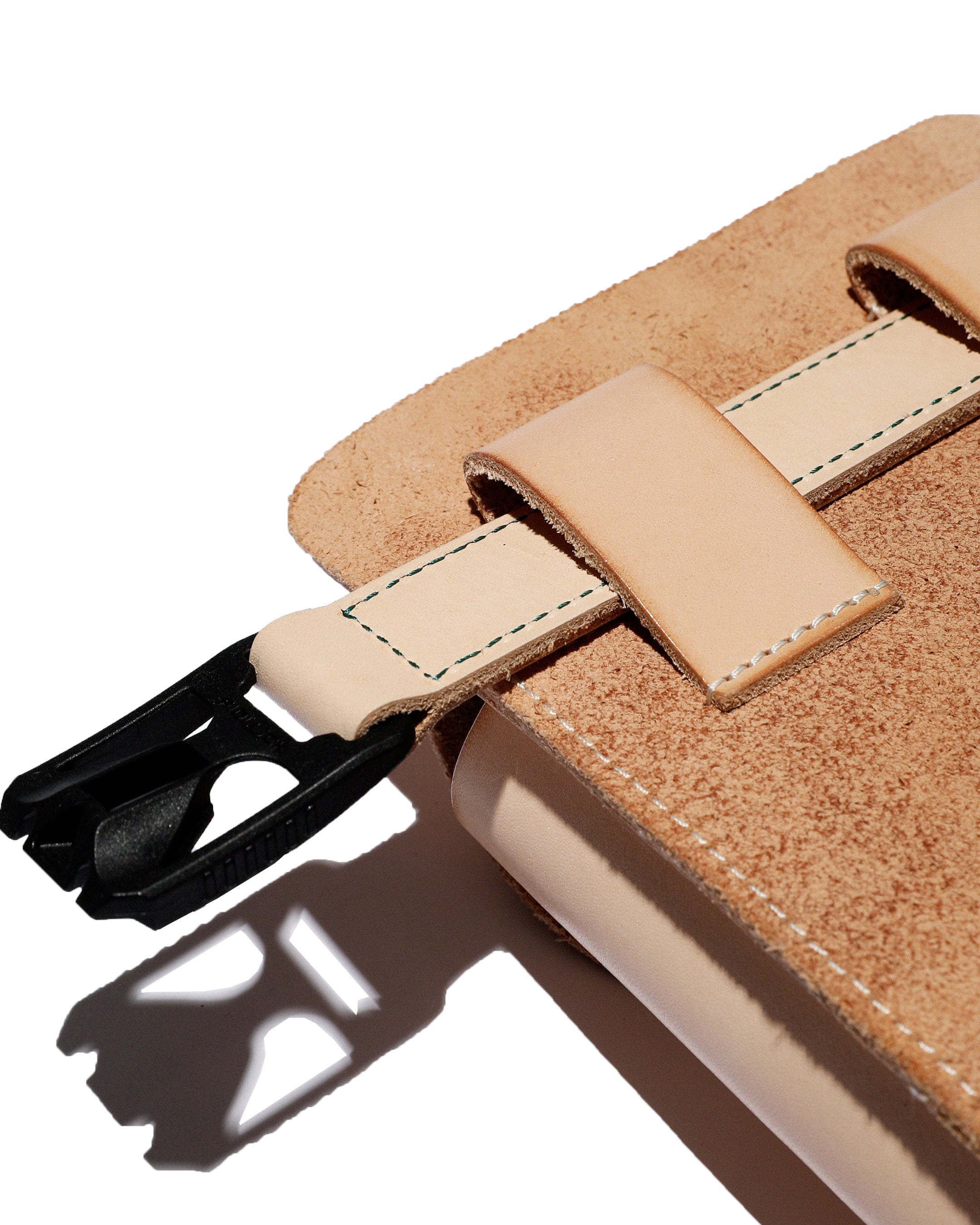ハサミやカッターその他の工具を持ち運び、ベルトに通し身につけるシザーケース。持ち運ぶ際に飛び出さないためにかぶせがあり、装着部はドイツ製マグネットバックルFidlockを使用。